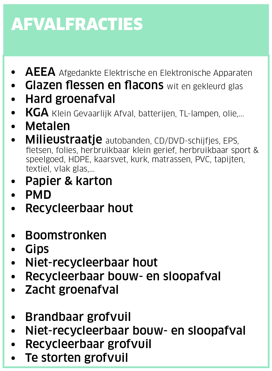 Bijzondere regelingen of wijzigingen worden bekendgemaakt op het recyclagepark en in de gemeentelijke infokrant of mail naar milieudienst@kuurne.be, T 056 73 71 46.
