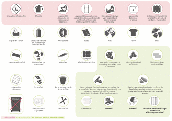 Net zoals een gezin het huishoudelijk afval moet sorteren, heeft een bedrijf ook verplichtingen. Elke organisatie moet zijn afval sorteren aan de bron. Zo raakt recycleerbaar afval niet foutief bij restafval.