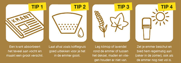 - Hou je emmertje fris door vochtig afval van etensresten te laten uitleggen, in krantenpapier te wikkelen of af te wisselen met droog afval. Zet de emmer in de schaduw en maak regelmatig schoon. Ook verse lavendel, klimop of een paar druppels lavendelolie helpen tegen vliegjes in de emmer.