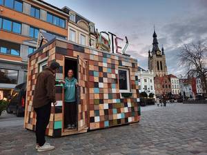 Midden op de Grote Markt prijkt tijdens stadsfestival WONDER een opvallend bouwwerk: Hotel DeVondst, een tinyhotel voor twee personen, volledig opgebouwd uit gerecycleerde materialen.