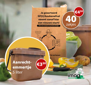 Dit jaar startte de inzameling van GF(t)/keukenafval. Om dit praktisch makkelijk te laten verlopen, introduceert Imog keukenafvalzakjes en aanrechtbakjes. De zakjes zijn 100% composteerbaar, houden je GF(t)-emmer netjes, voorkomen geurtjes en leveren extra biogas op bij verwerking. Ze mogen mee in de GF(t)/keukenafvalemmer. Deze zijn terug beschikbaar op alle intergemeentelijke recyclageparken.